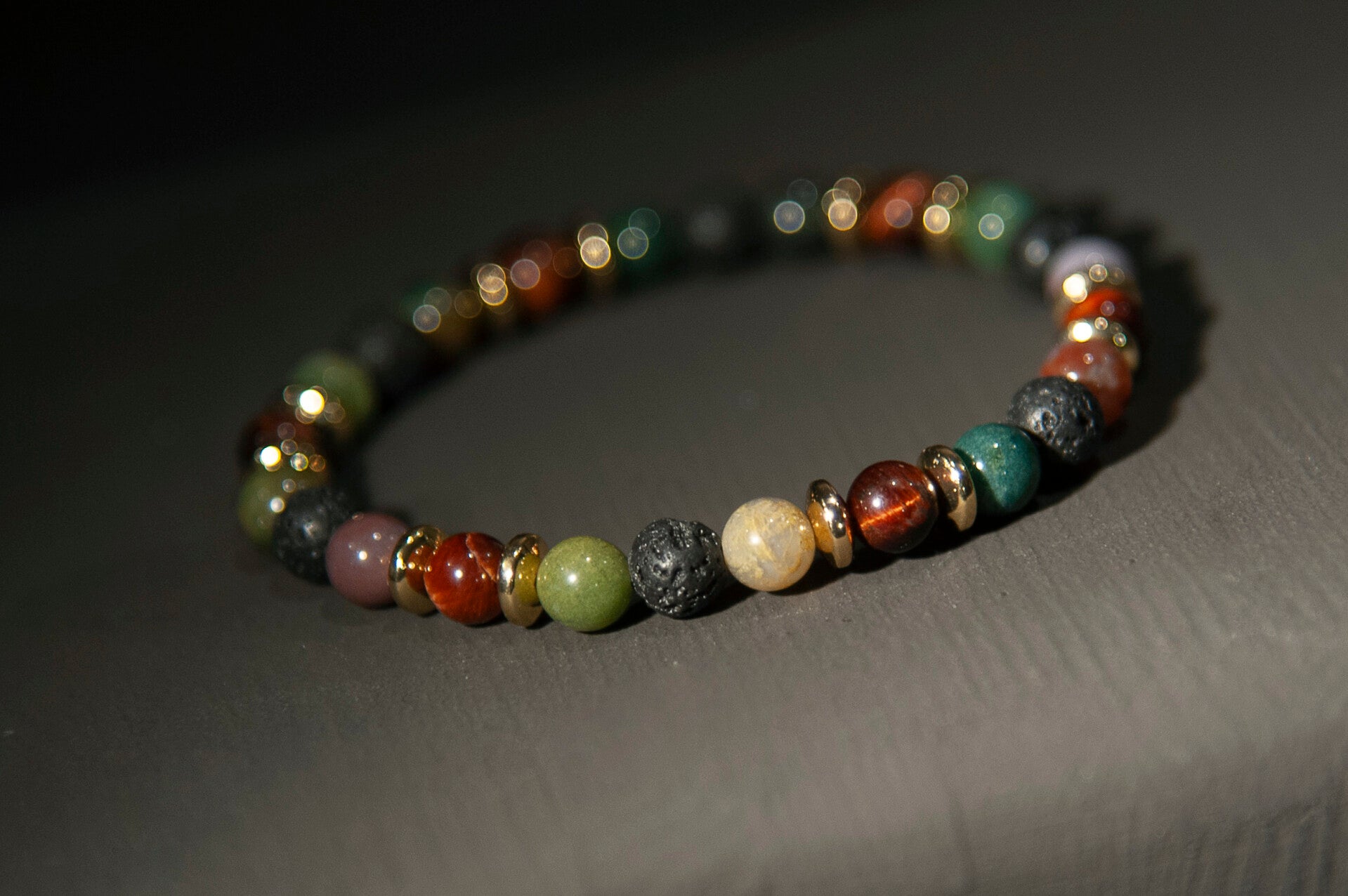 Armband - Indischer Achat, rotes Tigerauge & Lavastein mit Goldperlen